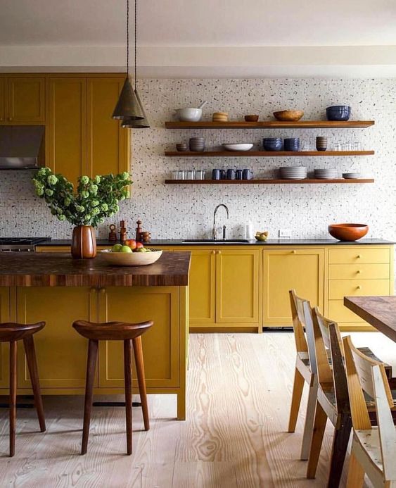 Che ne pensate di colorare moduli base e pensili della cucina con la nuance antique moss? Molto fine se in abbinamento con piani di lavoro in legno o in quarzo. Nel caso scegliete una rubinetteria ottone brunito o nichel nero opaco.