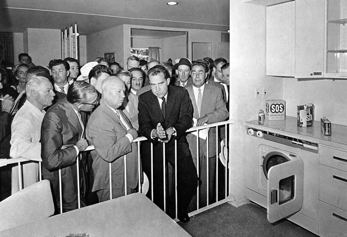 Richard Nixon e Nikita Khrushchev discutono all’American National Exhibition a Mosca, Russia, 1959 – Foto di Associted Press