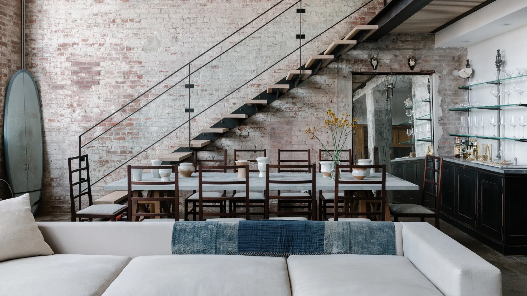 Il loft a Brooklyn di Jose Alvarez, confounder del brand Abbott, e della moglie sorge all’interno dell’ex fabbrica Esquire Shoe Polish (il lucido da scarpe più venduto d’America), sapientemente restaurato e recuperato dallo studio d’architettura MeldNYC e dall’interior designer Jae Joo. Il living è un ambiente luminoso a pianta libera, con arredi di recupero e pezzi di design, come la poltrona Flag Halyard di Hans Wegner e il tappeto di Beauvais Carpets.