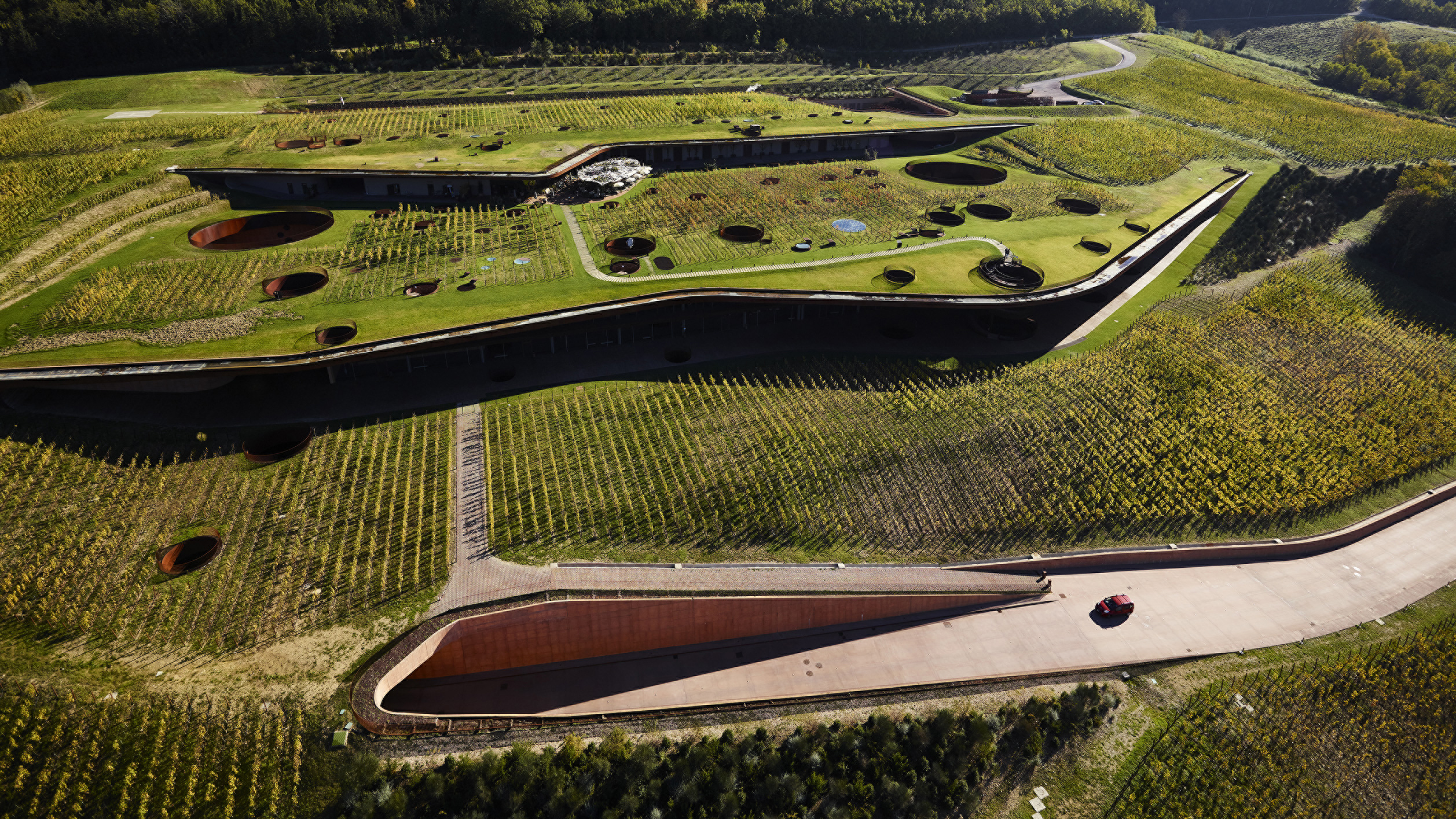 Per proteggere e valorizzare il contesto è stata immaginata una struttura integrata nella terra e nella vigna estesa persino sotto il livello del suolo.